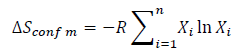 你可能会觉得,“无序”听起来不太妙?但在材料科学里,“高熵”却成了一种新潮流。2006年,中国台湾清华大学的叶均蔚教授提出了“高熵合金”的概念:由五种或五种以上等量或大约等量的金属形成的合金[3]。以往人们认为,合金中加的金属种类越多,其材质会越脆,因此以前的合金中主要的金属成分往往只有一至两种。但高熵合金的出现打破了传统理念,它们含有多种金属成分却不会脆化。后来,这一理念延伸到陶瓷领域,诞生了高熵陶瓷。这类材料中的摩尔混合构型熵ΔSconf m可以用下面这个公式计算[4]: