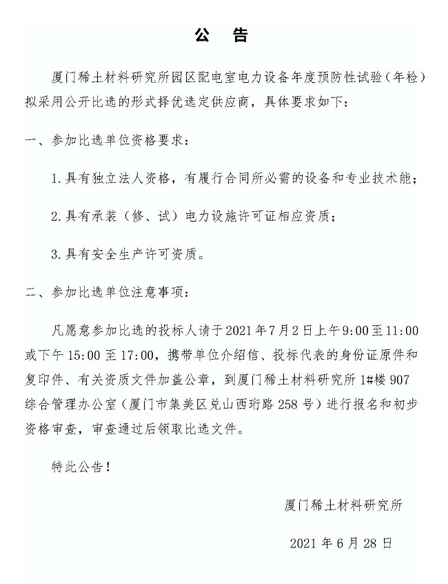 厦门稀土材料研究所园区配电室电力设备年度预防性试验(年检)招标公告