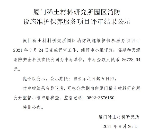 厦门稀土材料研究所园区消防设施维护保养服务项目评审结果公示