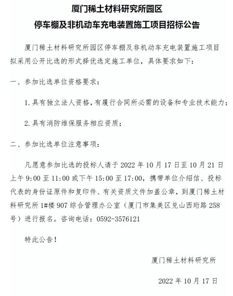 厦门稀土材料研究所园区停车棚及非机动车充电装置施工项目招标公告