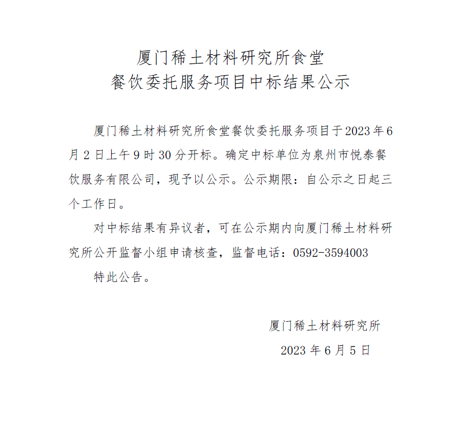 厦门稀土材料研究所食堂餐饮委托服务项目中标结果公示