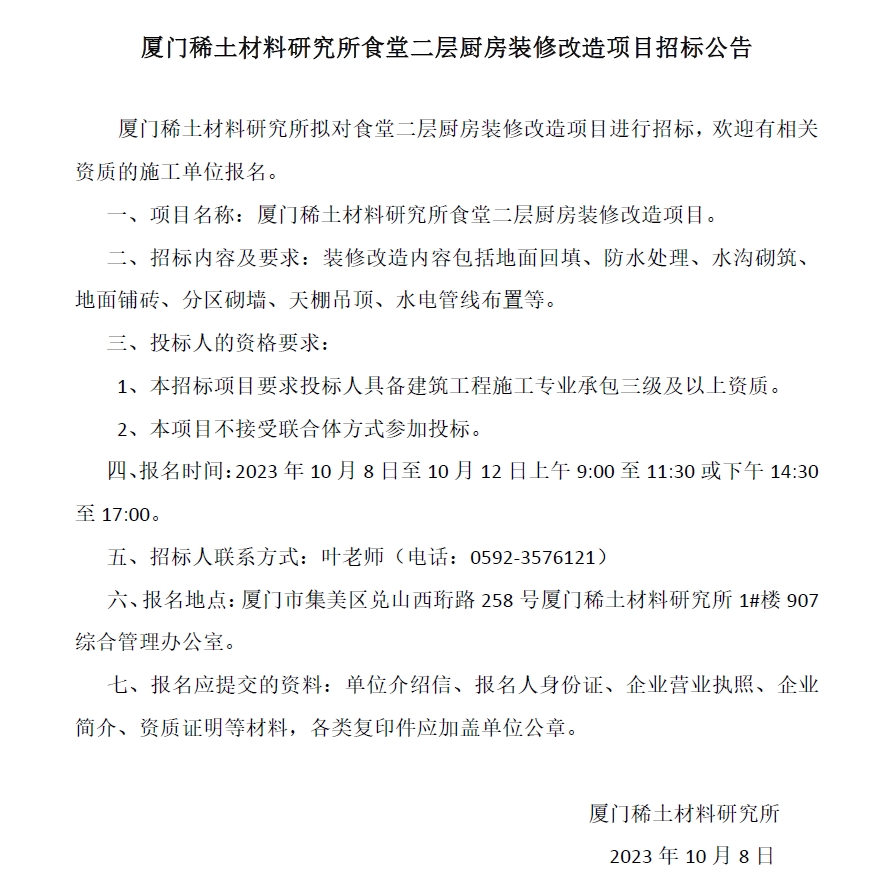 厦门稀土材料研究所食堂二层厨房装修改造项目招标公告