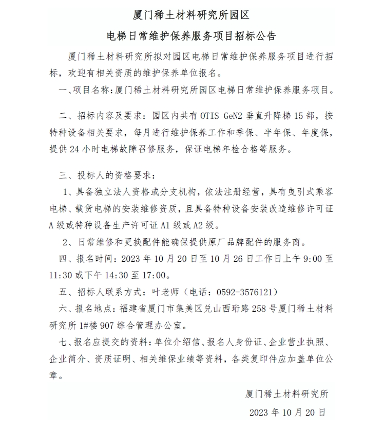 厦门稀土材料研究所园区电梯日常维护保养服务项目招标公告