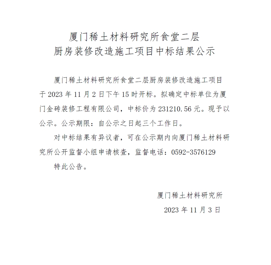 厦门稀土材料研究所食堂二层厨房装修改造施工项目中标结果公示